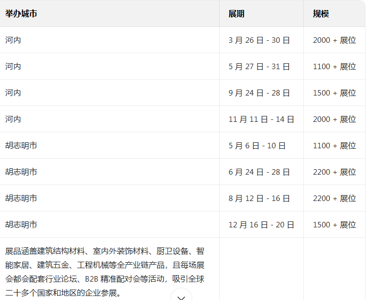 2026 年越南建材展以 VIETBUILD 系列巡回展为主,同时还有多场聚焦不同细分领域的专业建材展会,覆盖河内、胡志明市两大核心城市,适配不同建材企业的参展需求,以下是详细信息: